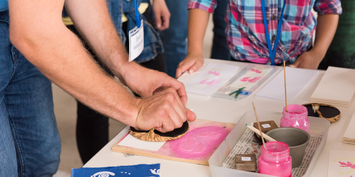 日本の伝統文化を短時間で気軽に体験できるプログラム。江戸木版画で紅葉や高尾山にいる小動物のデザインのブックマークを作成します。