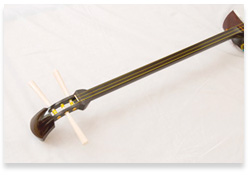 A string is called `Ito` in shamisen. Looking at the front of the player holding shamisen, it is called the first string, the second string and the third string from the top. The first string is tuned the lowest and the third one is the highest. The material is mainly silk but sometimes chemical fibers such as Dacron are used.
