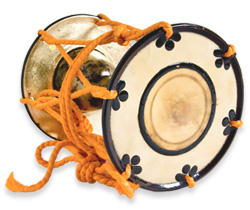 能、歌舞伎や民俗芸能で用いられます。小鼓と同様の形で、胴(桜)、革(牛の革)、調べと3つからできていますが、サイズは一回り大きく、「おおかわ」とも通称されます。大鼓は、小鼓のように肩にかつがず、左ひざの上に置き、左手で調べを握って、右手の中指と人差指につけた指皮で、打ち下ろすように革を打ちます。