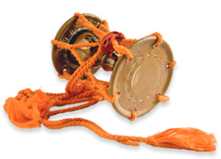 O-tsuzumi is used in Noh, Kabuki and folk performance. It is made of 3 parts, Doh (cherry tree), Kawa (a cow-skin leather) and Shirabe( a string) and the same shapes as Ko-tsuzumi. The size is much bigger and it is sometimes called ‘Ohkawa’. O-tuzumi is not held on the player’s shoulder unlike Ko-tsuzumi. It is placed on the left knee. Kawa is stricken like hitting down by the finger leather attached to the middle finger and an index finger of the right hand, grasping Shirabe (strings) with the left hand.
