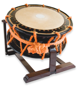 The type of Taiko which is usually used as an instrumental music of Japanese music is called Shimetaiko. The structure of Doh, Kawa and Shirabe is the same as Ko-tsuzumi and O-tsuzumi. Doh is made of zelkova tree. The diameter is longer than Ko-tsuzumi and O-tsuzumi, but the width is extremely narrow. Kawa is a cow skin and about 4 centimeters diameter size of deer skin called Bachi kawa is stuck in the middle of the front skin. Shirabe made of hemp is fixed in order to fasten it strongly and the tone is adjusted by fastening. It is placed on a special stand made of any hard tree such as an oak tree or rosewood and played by striking with a pair of plectrums made of cypress called ‘Bachi.’