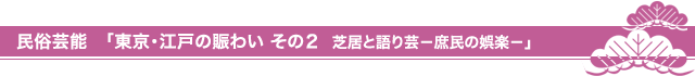 平成21年11月の民俗芸能公演「東京・江戸の賑わい」に続く第二弾。今回は東京の地で庶民が楽しんでいた娯楽の中から、三つの「芝居」とさまざまな「語り芸」を上演します。